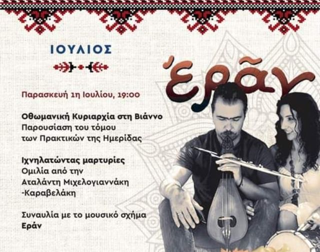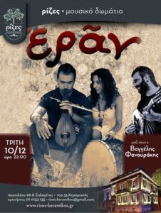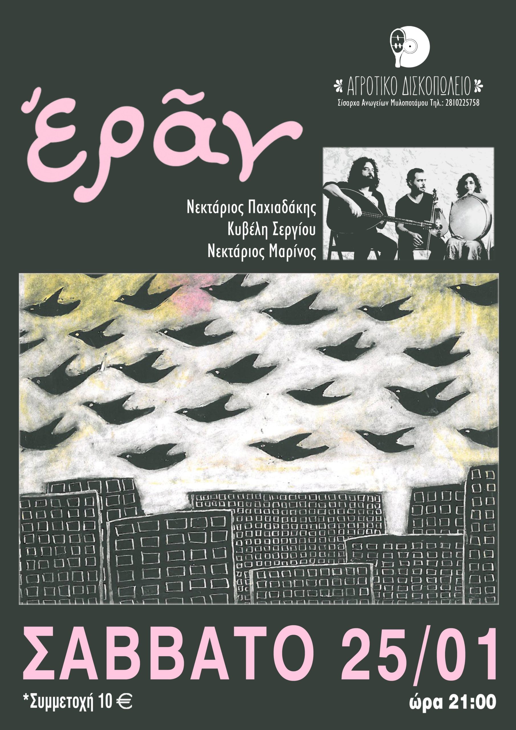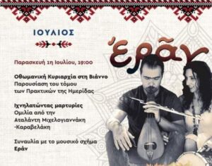 Συναυλία με Εράν, την Παρασκευή 1 Ιουλίου στο Πνευματικό Κέντρο Βιάννου Π. Βλαχάκης με Κυβέλη Σεργίου , Βαγγέλης Φανουράκης και Giannis Dermitzakis