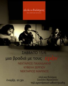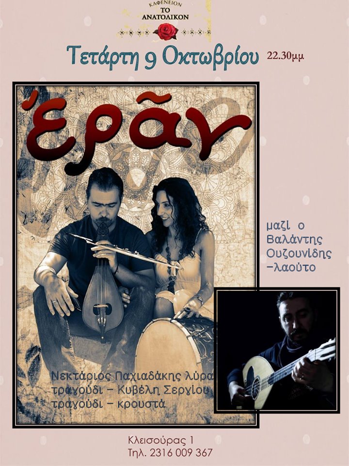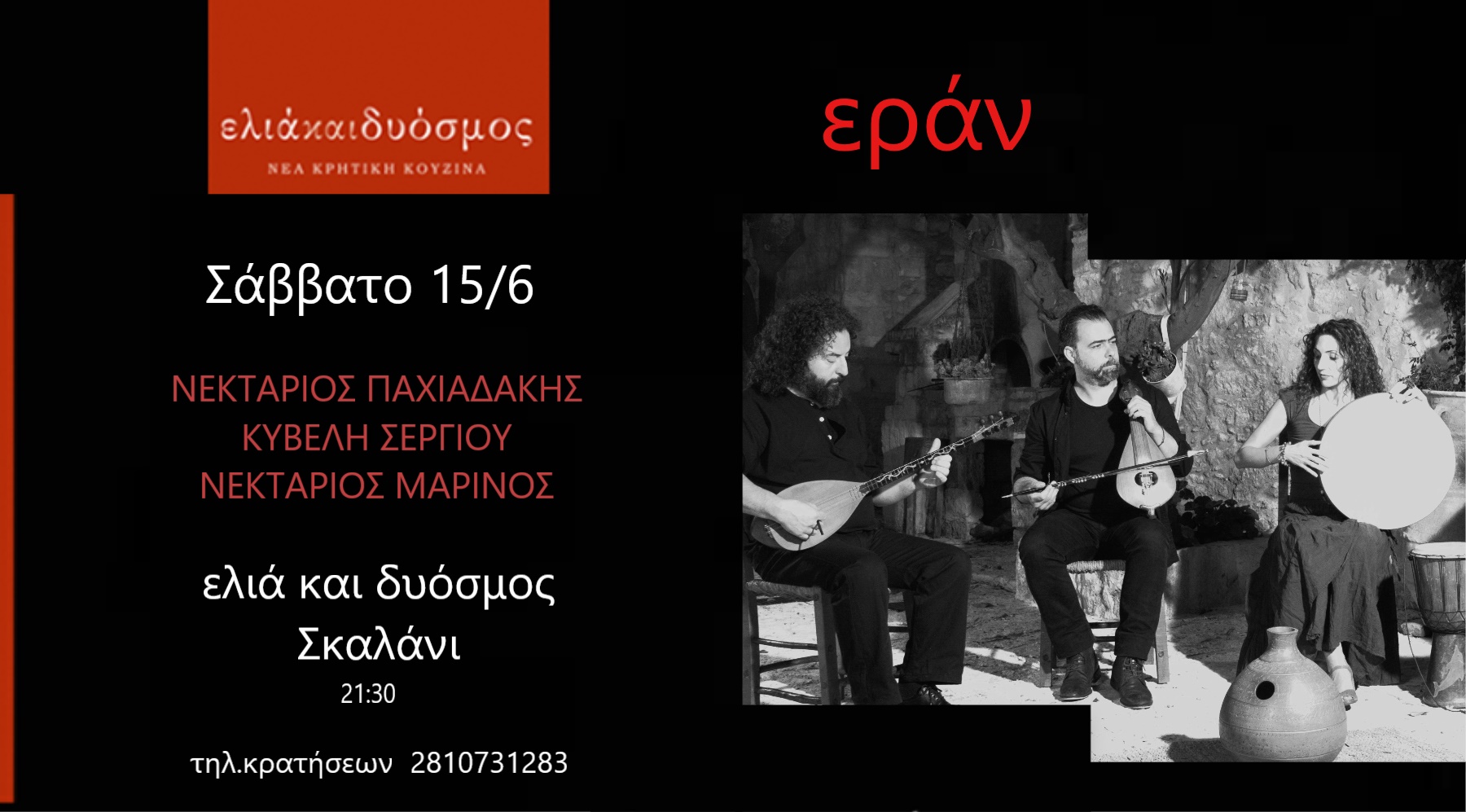 Όταν η γαστρονομική απόλαυση της κρητικής κουζίνας συναντά υπέροχους μελωδικούς σκοπούς. Στο γνωστό σε όλους εστιατόριο << Ελιά και Δυόσμος >> στο Σκαλάνι Ηρακλείου , το μουσικό συγκρότημα Εράν με γνωστά και άγνωστα τραγούδια , παραδοσιακά , μικρασιάτικα και δικές τους συνθέσεις , το Σάββατο 15/06/2019 στις 21:30 το βράδυ , σε μια υπέροχη αυλή.